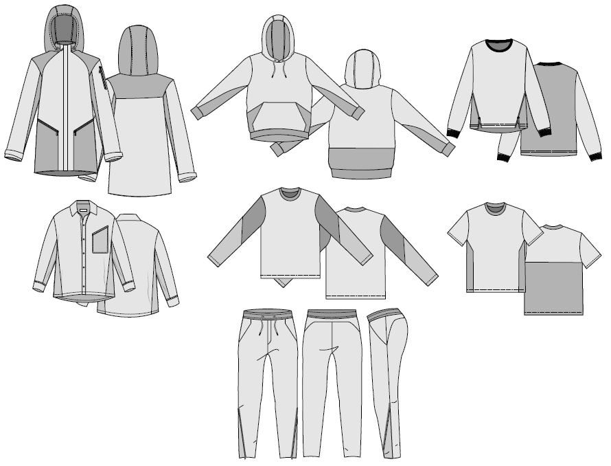 As part of my time at Looptworks (just before COVID), I worked on developing a collection inspired by athletic wear silhouettes, playful abstract line work, and utility-driven details. The goal was to balance sleek design and everyday function while prioritizing eco-conscious materials and processes.
